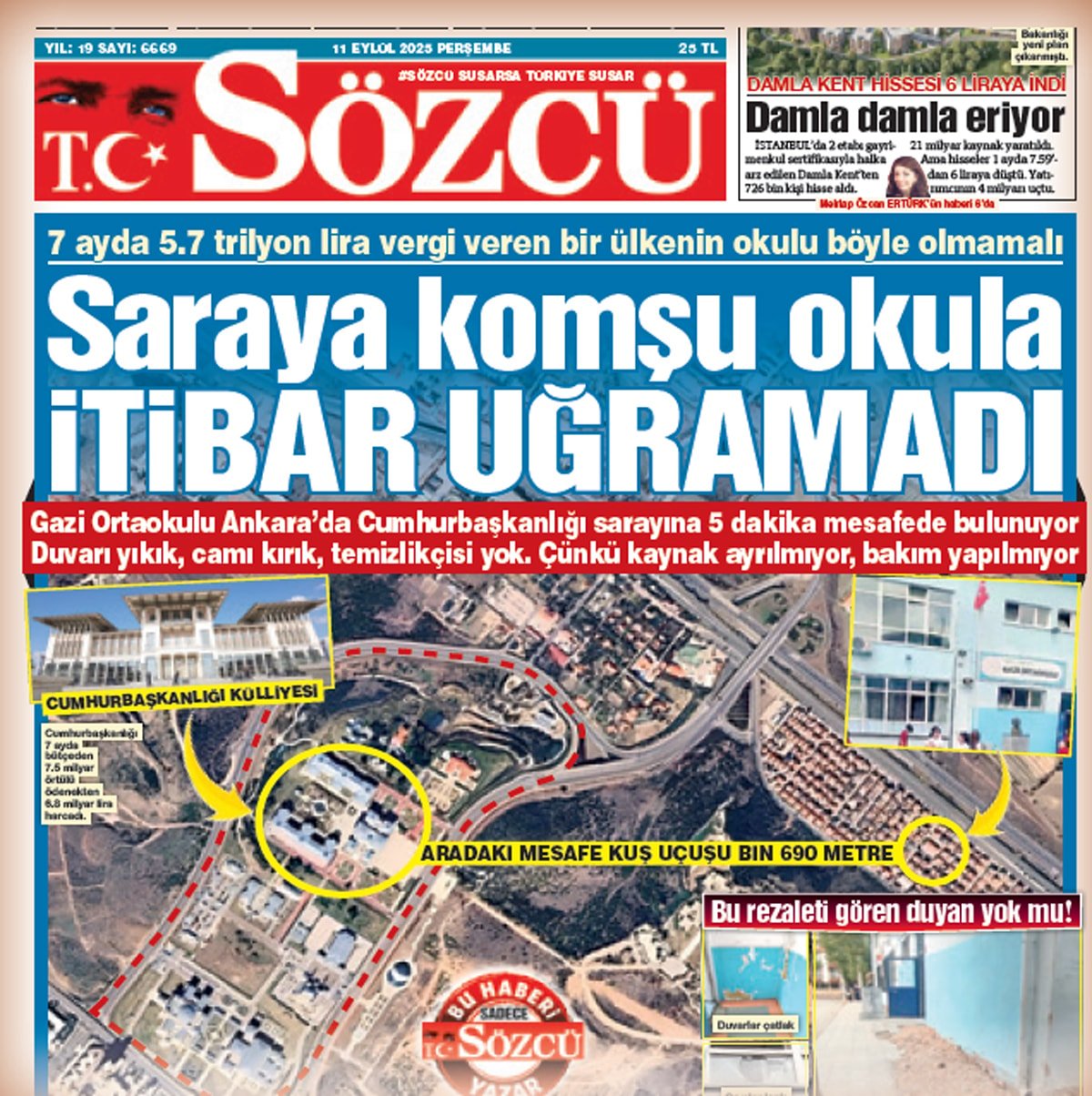 Milli Eğitim Bakanlığı, Cumhurbaşkanlığı Sarayı’na 5 dakika mesafedeki Gazi Ortaokulu’ndaki sefaleti SÖZCÜ sayesinde nihayet gördü! SÖZCÜ’nün dün, “Saraya komşu okula itibar uğramadı” manşeti üzerine Ankara İl Milli Eğitim Müdürü Murat Küçükali ile Yenimahalle İlçe Milli Eğitim Müdürü Muhammet Fatih Zengin, dün sabah okula giderek incelemede bulundu. İlk iş olarak okulun bütün kırık camları aynı gün değiştirildi.